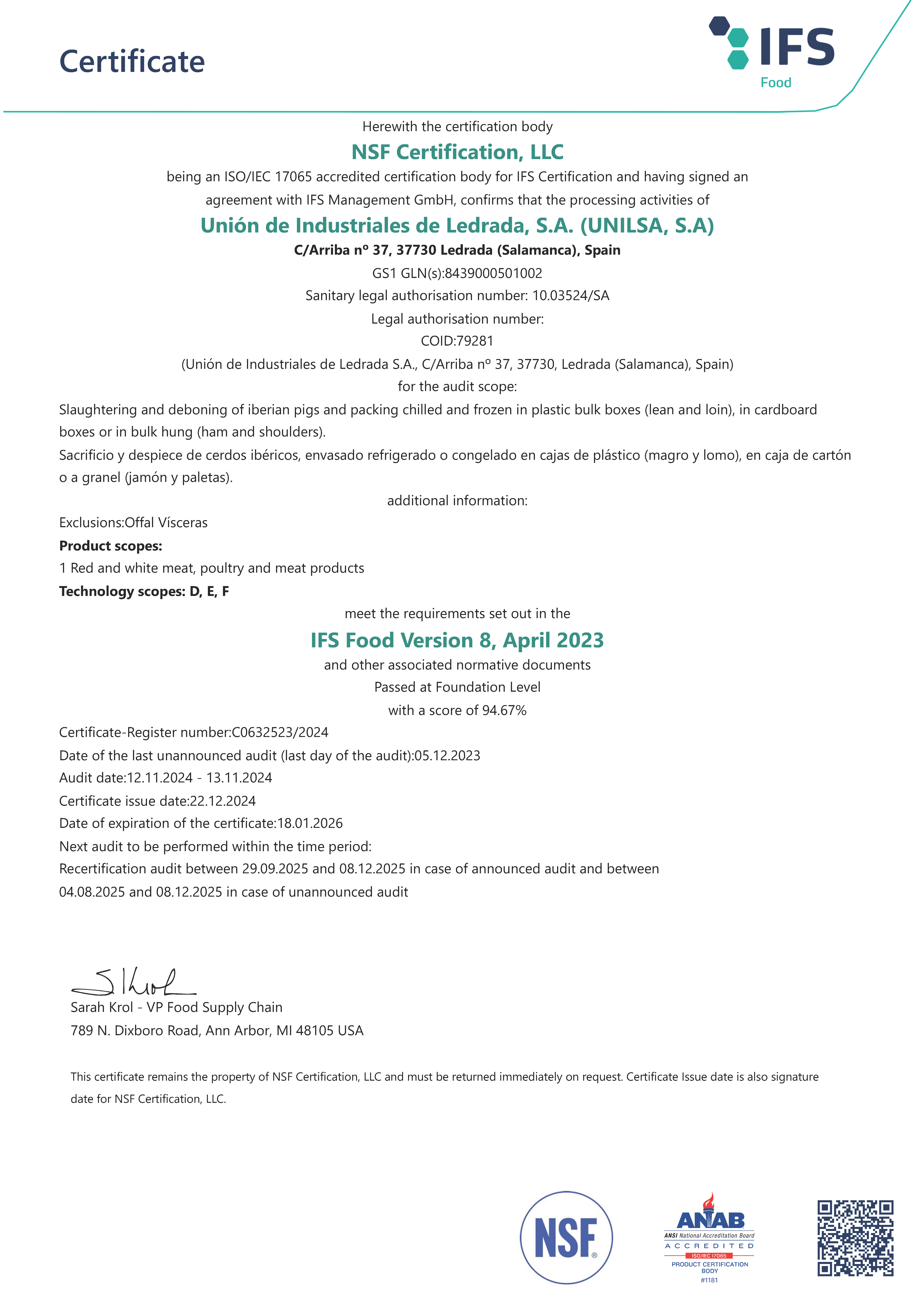 UNILSA dispone del prestigioso certificado IFS FOOD alemán en su versión 8 que acredita el cumplimiento de los máximos estándares de la industria.