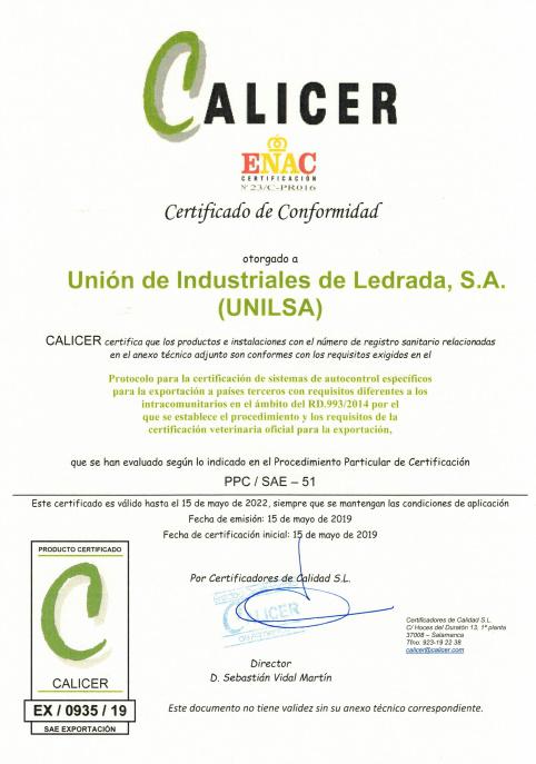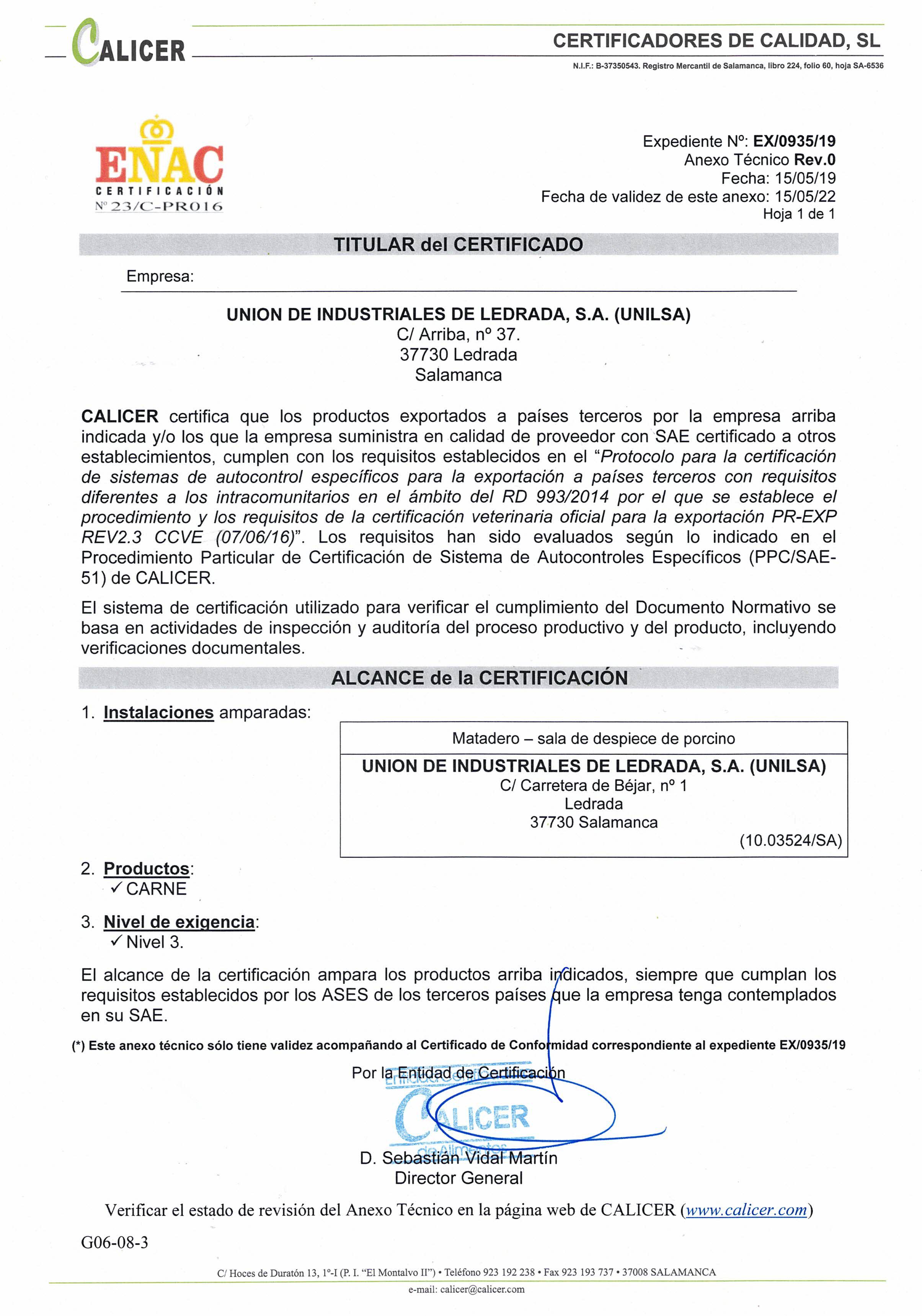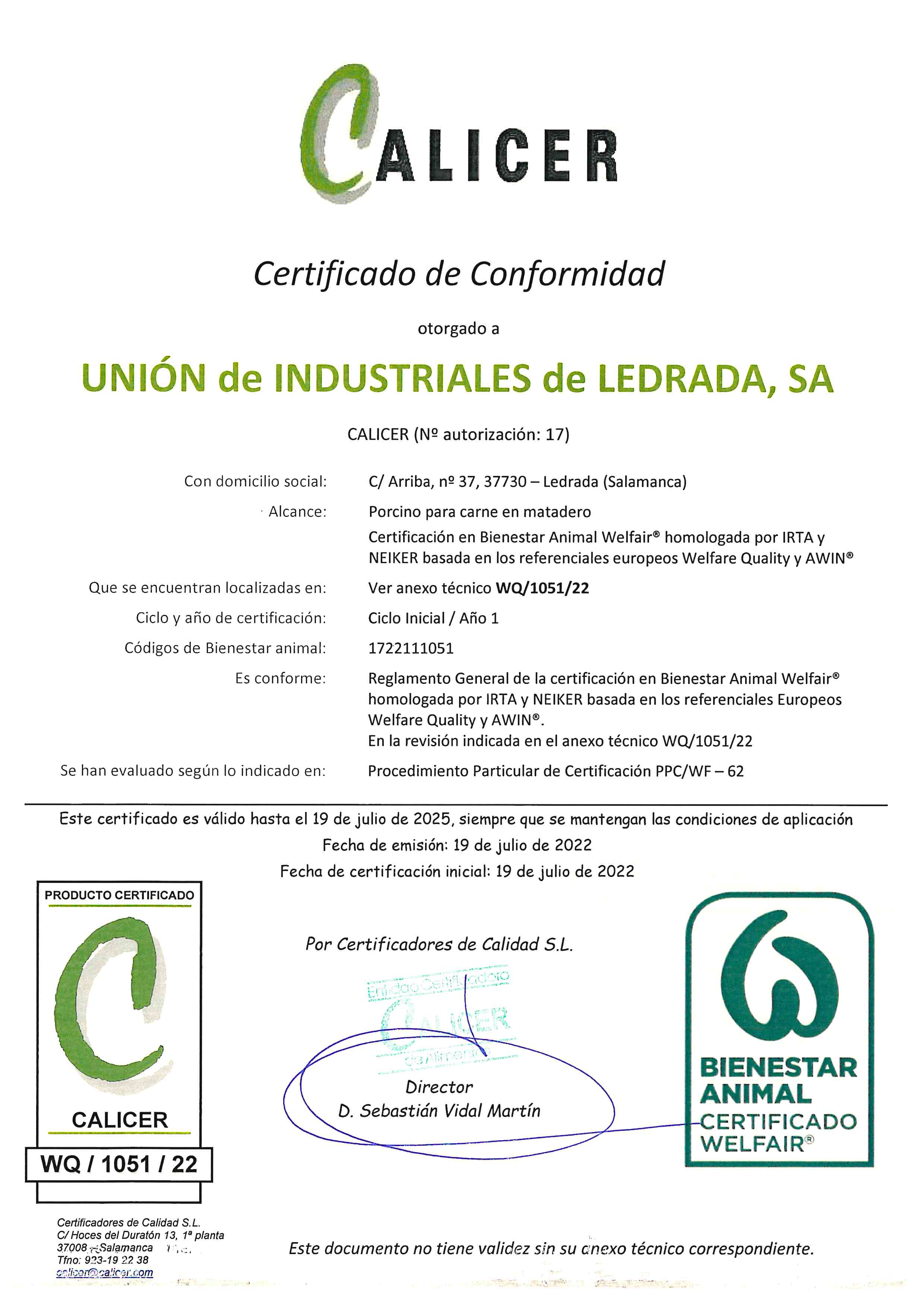 Calicer, certifica que los productos distinguidos y amparados bajo los marcas definidos en el Anexo Técnico adjunto y los procesos definidos en el mismo son conformes con las exigencias de la "Norma de Calidad para la carne, el jamón, la paleta y la caña de lomo ibérico"