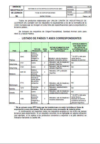 Ficha de especificación de los productos elaborados por UNILSA para la exportación a terceros países.